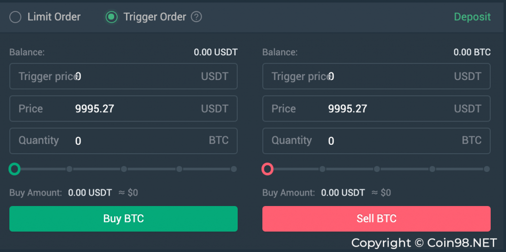 Ví dụ: Giá BTC hiện tại là 10.000 USDT và mức kháng cự khoảng 10.300 USDT. Nếu anh em muốn mua giá BTC vượt qua ngưỡng kháng cự, Trigger Order có thể đặt như sau: