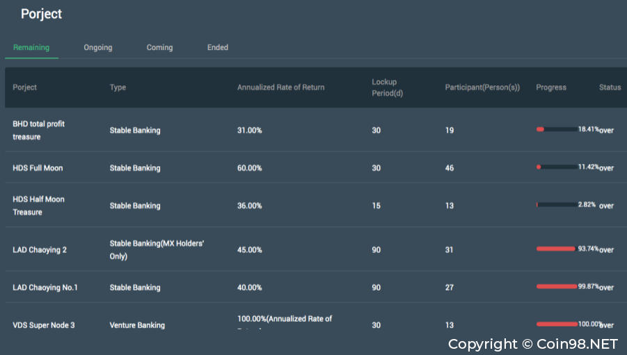 Trong tính năng này, người dùng sẽ lock coin/token của họ trên sàn MXC và nhận lại phần thưởng là lãi suất tương ứng trong thời gian đó. Tính năng này tương tự như BitTreasure của BitMax hay CryptoFarm của OceanEx.